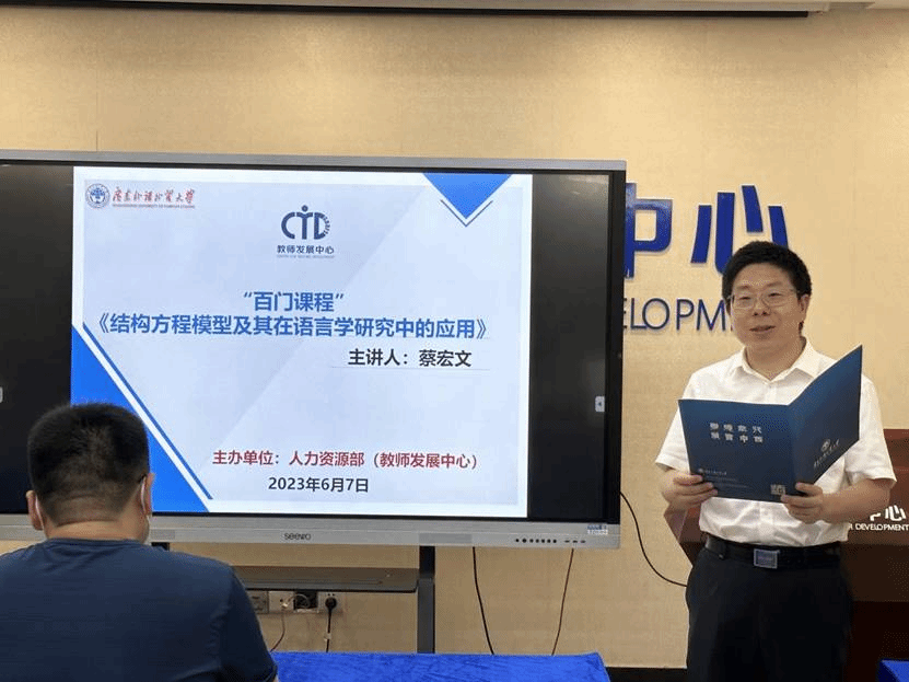 本网讯 2023年6月7日下午,广东外语外贸大学人力资源部(教师发展中心)主办的“百门课程”《结构方程模型及其在语言学研究中的应用》顺利开讲,由我校外国语言学及应用语言学研究中心蔡宏文教授主讲,课程开班仪式由教师发展中心副主任董俊武教授主持。