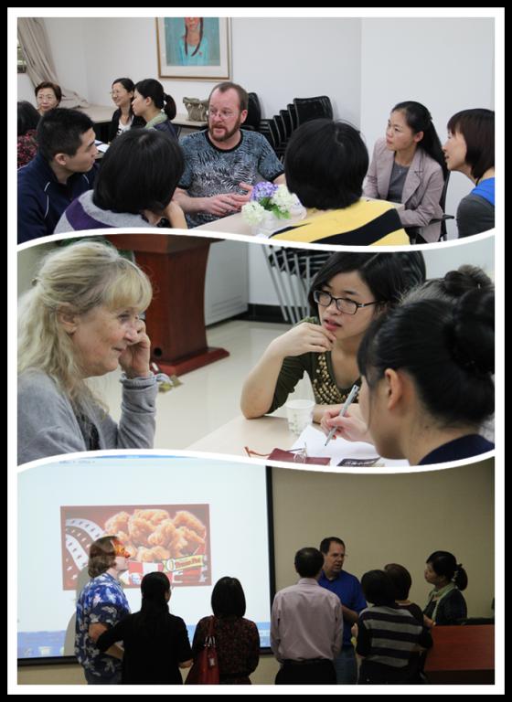 David、Robert、John以及Terry4位外籍教师各领一组,以“food culture”为话题,和教职工开展了轻松愉快的交流。David精心准备了许多漂亮的美食图片,包括“hamburger”等各种美国特色食物,并和Robert一道兴致昂扬地为在场的教职工讲解了每一张图片背后的“美国故事”,如美国的“hamburger”与中国肯德基和麦当劳的汉堡包的区别。John和Terry也在纸上为大家写写画画,介绍一些美国的特色美食及相关的饮食文化。活动现场到处洋溢着欢声笑语,大家边吃边聊,毫无拘束。