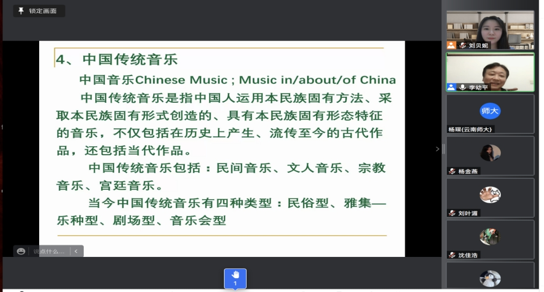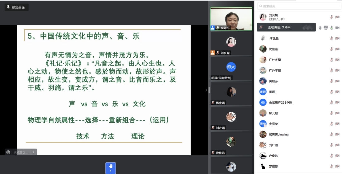 李幼平教授通过对中国传统文化中声、音、乐的内涵辨析,讲解了中国传统音乐的历史分期及各时期不同类型的音乐风格、艺术特征,自先秦乐舞时期的钟磬礼乐、中古伎乐时期的丝竹音乐以及宋元明清时期的戏曲俗乐,至西学东渐的中国近现代的音乐历史回顾,展示了考古发现的钟磬金石、笙箫丝竹等乐器,分析点评了“八音合鸣”的音响特征以及《杏花天影》《阳关三叠》等中国传统音乐经典曲目,阐释了音乐与科学的紧密联系,在传统这条河流不断流变和发展的过程中,始终都有中国传统优秀音乐文化的根基所在,进一步阐明了音乐在中华文明发展进程中的历史文化价值与现实意义。