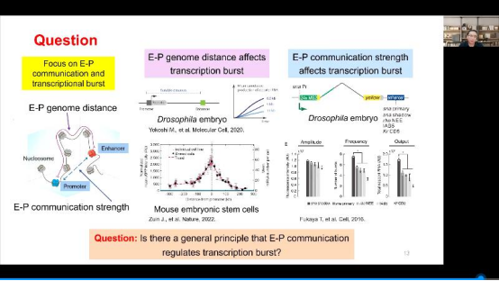 首先,周天寿教授作了题为“基于实验数据的统计推断”的报告。他在报告中结合单细胞测序数据与机制性模型的统计推断方法,推断出转录爆发运动学的特征与反馈调控的类型。他指出,基因组水平上的爆发运动学蕴含了辛普森悖论,在有反馈和没有反馈情形下展示出不同的特征,仅在正反馈情形下TATA基因才以高爆发频率的方式表达,此时增强子与启动子之间的相互作用才是主要调幅爆发频率