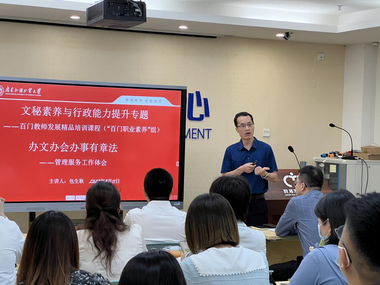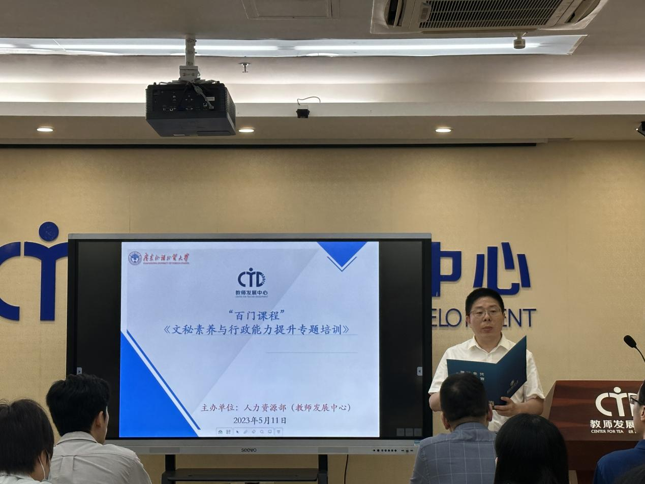 本网讯 2023年5月11日上午,由广东外语外贸大学人力资源部(教师发展中心)主办的“百门课程”《文秘素养与行政能力提升专题培训》正式开讲。我校新闻与传播学院党委书记包生耿和党委办公室(校长办公室)副主任李韬讲授了课程第一课。课程开班仪式由教师发展中心副主任董俊武教授主持。