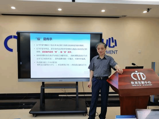 26日上午,王初明教授以《续理论及其对全英教学(EMI)的启示》为题开讲,重磅开启本阶段培训。王初明教授首先强调了全英教学符合当今外语教学的主流趋势,符合“续理论”的理论思想。他生动地讲解了“续”作为一种本质性的语言习得观对于促学的积极效应及其内在机理,以及如何运用续理论设计高效的教学过程、学习过程。王初明教授深入浅出的讲解,不仅使参训教师在全英教学方面收获颇丰,也使参训教师在如何做好科研方面深受启发。中心副主任董俊武也分享了自己的学习心得。参训教师们纷纷表示非常荣幸能够在现场听到王初明教授的讲座,今后会将“续理论”运用于全英教学,并通过学习“续理论”来更好地开展学术研究。