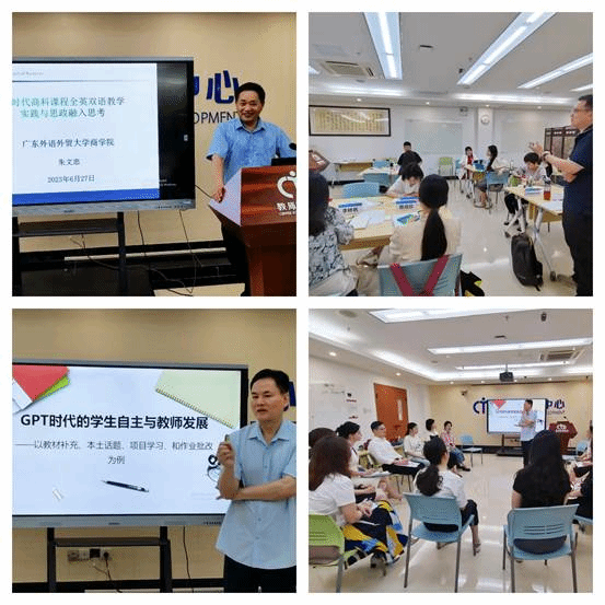 为进一步提升教师在人工智能时代的教学效率,适当转变教学思维,丰富教学形式,本次培训还邀请了英语语言文化学院教授欧阳护华就GPT时代的学生自主与教师发展问题开展了专题讲座。欧阳护华从教材补充、本土话题、项目学习和作业批改等四个方面,生动阐释了如何利用新型智能手段实现学生的自主发展和教师的教学能力提升。他从学理角度出发,给出了让学生自主发展的课堂设计建议。此外,研讨期间他鼓励年轻的参训教师们要敢于试错,多实践、多体验,做自己人生的导师。