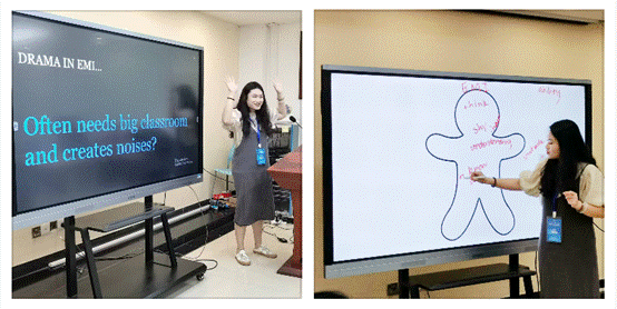 参训学员的个人风采展示也是此次培训的精彩环节之一。优秀代表刘妍如将自身专业应用戏剧与EMI教学方法相结合,向大家展示了如何在课堂中借用戏剧的张力,展现全英教学方式的更多可能性。其教学展示灵活运用了项目第一阶段的课堂互动技巧,生动有趣,寓教于乐,体现了项目良好的培训效果。