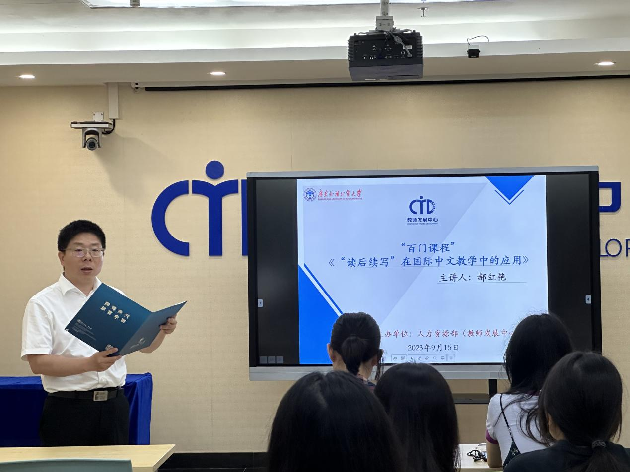 本网讯 2023年9月15日下午,由广东外语外贸大学人力资源部(教师发展中心)主办的“百门课程”《“读后续写”在国际中文教学中的应用》正式开讲。本次课程由广东外语外贸大学留学生教育学院学历教育教研室主任郝红艳教授担任主讲人,从国际中文教学的发展历程,内容,特点出发,详细讲解了国际中文读写教学的特点。课程开班仪式由教师发展中心副主任董俊武教授主持。