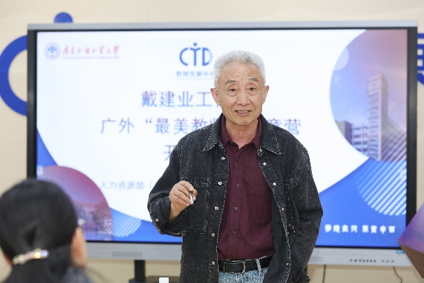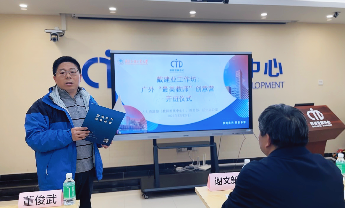 本网讯 12月29日下午,由学校教师发展中心联合招生办公室举办的戴建业工作坊:广外“最美教师”创意营在白云山校区教师发展中心105室举行。主讲人为我校中华文化国际传播学科建设云山工作室首席专家戴建业教授,学校各本科教学单位推荐共17名教师代表参加本次创意营。人力资源部部长、教师发展中心主任谢文新教授在开班仪式上致辞,他希望所有参训学员能在戴建业教授的带领下,绽放广外最美教师风采。开班仪式由教师发展中心副主任董俊武教授主持。