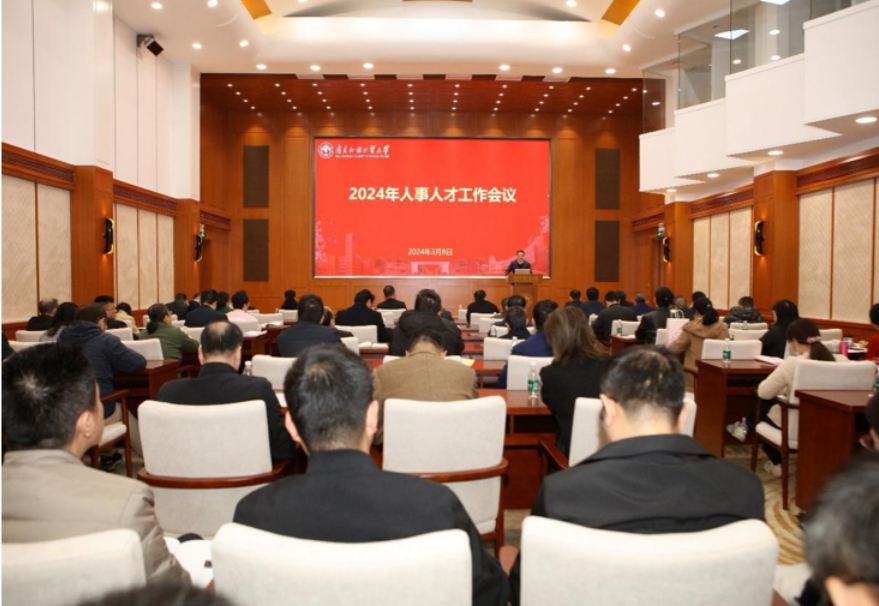 本网讯 3月8日上午,我校2024年人事人才工作会议在白云山校区国际会议厅举行。校党委书记石佑启、校长闫相斌、副校长申明浩,各教学单位院长(主任)、书记,党政群部门、科研单位、教辅机构主要负责人,以及人力资源部(教师发展中心)全体工作人员等参加会议。会议由闫相斌主持。