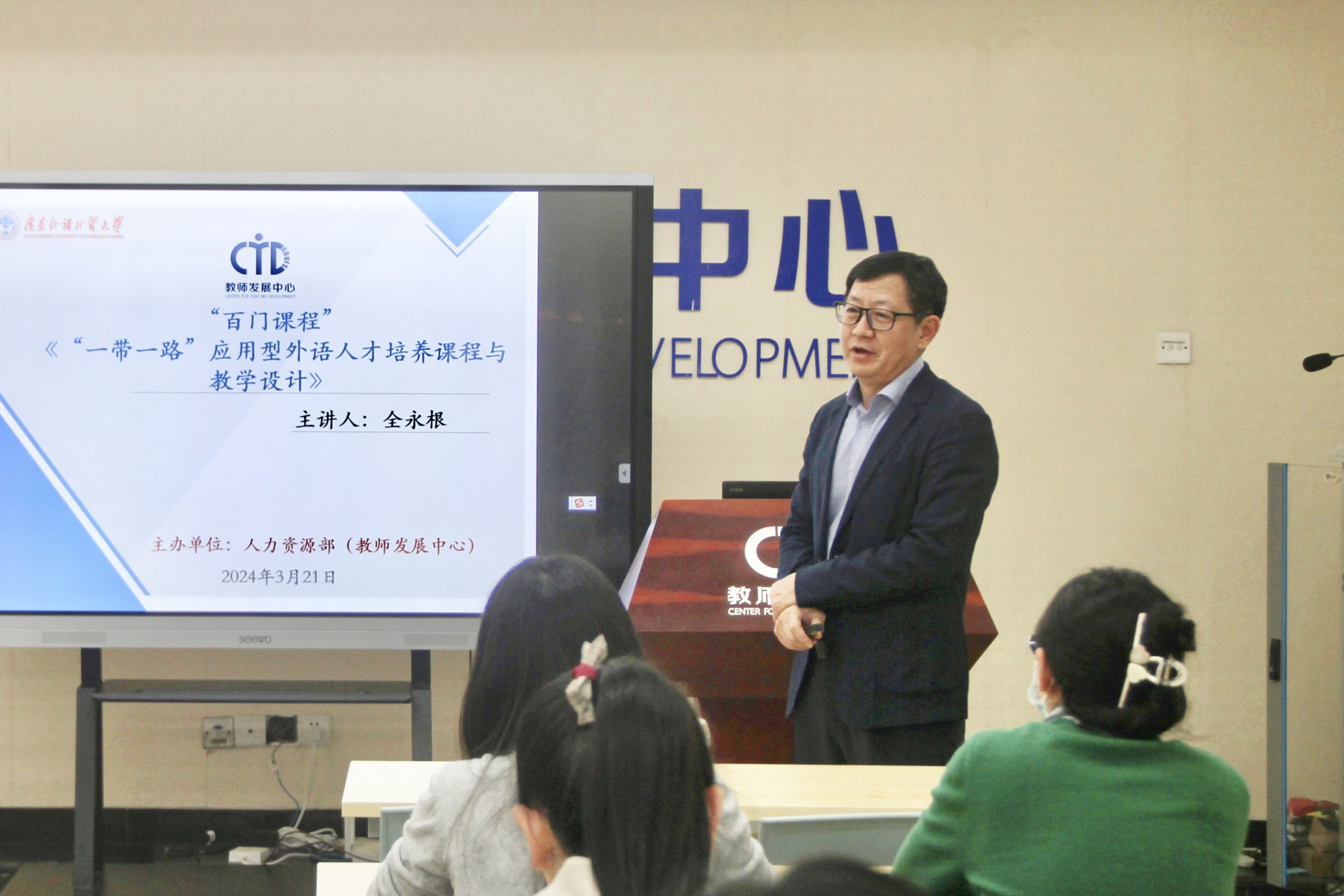 本网讯 2024年3月21日下午,由广东外语外贸大学人力资源部(教师发展中心)主办的“百门课程”《“一带一路”应用型外语人才培养课程与教学设计》在白云山校区教师发展中心105室正式开讲。主讲人为我校亚非学院院长全永根教授。课程开班仪式由教师发展中心副主任董俊武教授主持。