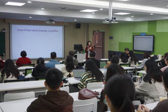 本网讯 2024年12月16日上午10点,由广东外语外贸大学人力资源部(教师发展中心)主办、广东外语外贸大学英文学院承办的著名教授论坛第684讲在广外白云山校区第一教学楼南楼223顺利举行。清华大学外国语言文学系教授、博士生导师,语言习得实验室主任杨小璐教授应邀做客著名教授论坛,做了题为“两岁汉语儿童的抽象语言知识:来自感知和理解方面的证据”的学术讲座。讲座由英文学院吴庄教授主持,英文学院陈哲教授、于浩鹏教授、陈李军博士,外国语言学及应用语言学研究中心梁利娟教授、马志刚教授、程航博士等教师及本、硕、博士生参加了此次讲座。