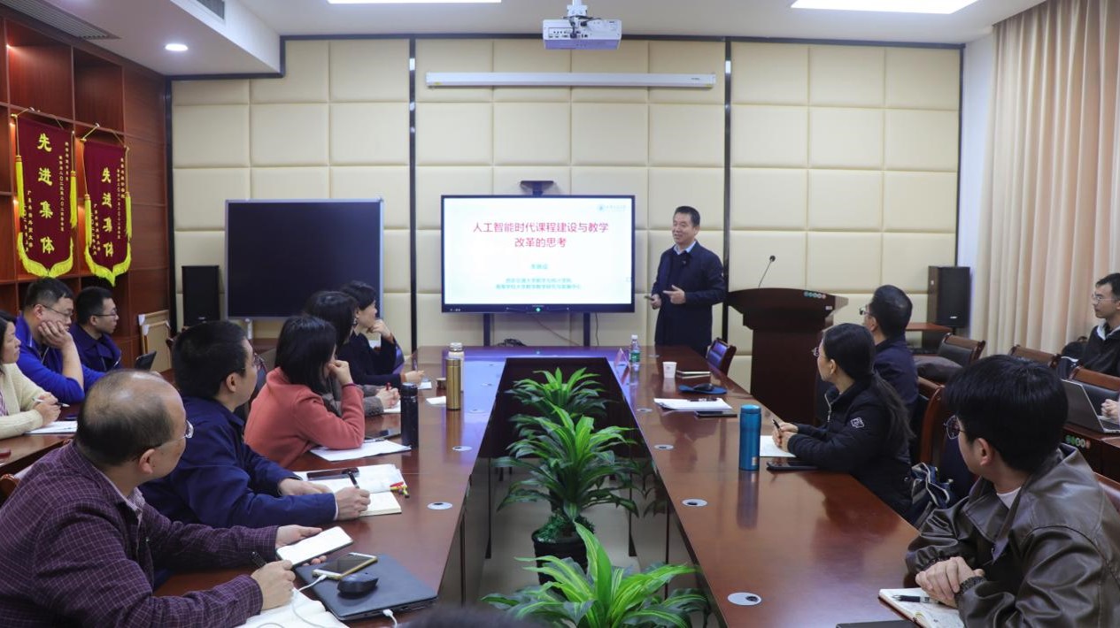 本网讯 12月13日上午,国家级教学名师、教育部高等学校大学数学课程教学指导委员会秘书长、西安交通大学李继成教授应邀做客著名教授论坛681讲,在大学城校区作题为“人工智能时代课程建设与教学改革的思考”的专题讲座。本次讲座由人力资源部(教师发展中心)主办,数学与统计学院承办。系部主任、课程负责人,及学科教学(数学)硕士研究生聆听了讲座。