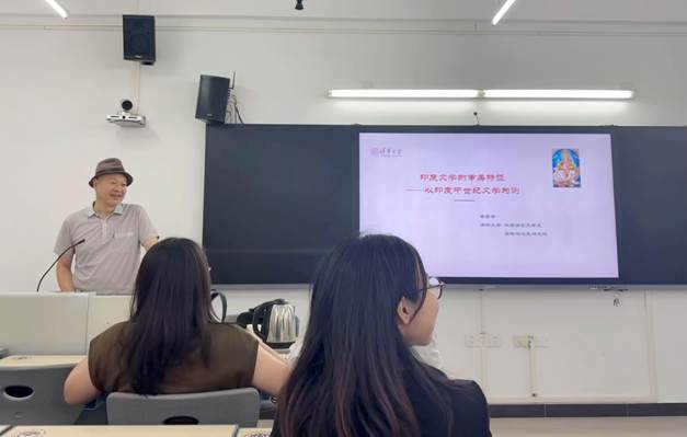 接着,姜景奎教授以中世纪印度文学名篇《苏尔诗海》为例,细致讲解印度文学应当如何审美。在讲解中世纪印度文学的特殊性时,姜教授简要梳理了当时的语言格局与宗教背景,特别强调了帕克蒂运动对宗教与文学创作的深刻影响。针对《苏尔诗海》的具体诗篇,姜教授结合印地语伯勒杰方言的音韵结构,深入阐述了印度文学中所展现的三重美感——人物美、瑜伽美与名号美。在此基础上,姜教授将印度文学的审美特征总结为三点:源于生活、便于理解、民间可见。这些特征不仅体现了印度文学与宗教、社会生活之间的紧密关联,也彰显出其深厚的文化底蕴与普世传播力。