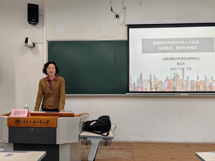 本网讯 2025年11月21日上午9时30分,由广东外语外贸大学人力资源部(教师发展中心)主办、广东外语外贸大学英语教育学院承办的著名教授论坛第720讲在大学城校区教学楼F403顺利举行。本讲座由上海外国语大学跨文化研究中心主任、博士生导师张红玲教授主讲,广东外语外贸大学云山学者秦丽莉教授主持,讲座主题为“数智时代跨文化外语人才培养:实践驱动、赛教融合模式”。
