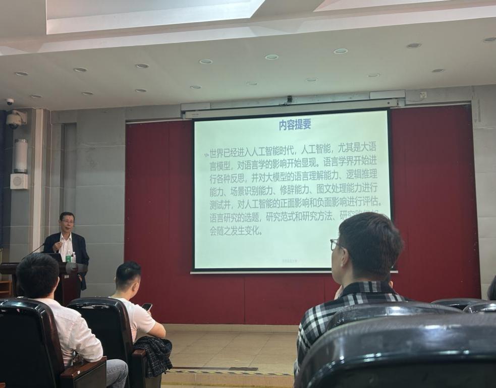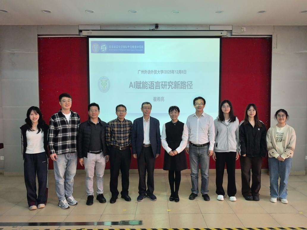 本网讯 2025年12月8日上午,著名教授论坛第727讲在白云山校区第七教学楼尚行报告厅举行。本次讲座由人力资源部(教师发展中心)主办、语言学习与人工智能研究院承办,讲座邀请北京语言大学原校长、世界汉语教学学会副会长崔希亮教授作题为“AI赋能语言研究新路径”的专题讲座。讲座由语言学习与人工智能研究院院长王治敏教授主持。