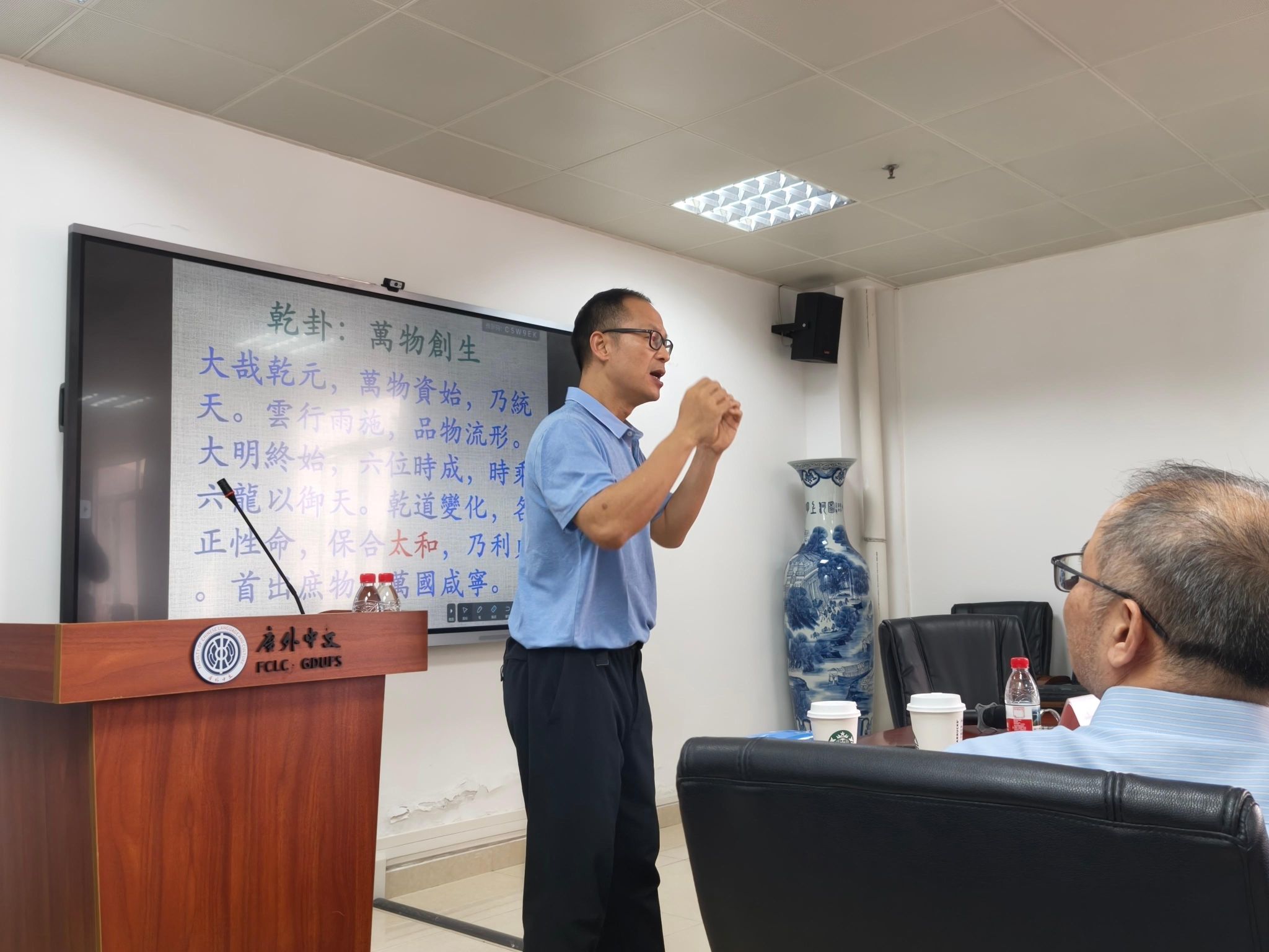 会上,黎子鹏教授首先阐明了《易经》的意义:《易经》作为“群经之首、大道之源”,本质是阐释宇宙人生变化规律的“变化之书”,其思想深度适配当下时代变局,不仅是中国文化的核心经典,更是全人类的精神资源。其中,黎子鹏教授结合乾卦、坤卦等核心卦象,以故宫太和殿、清华校训、韩国国旗等文化符号为例,解读《易经》“自强不息、厚德载物”的精神内核。更强调,研读《易经》需以心灵情感与经典感应,而非仅作哲学思辨,并现场示范《易经》吟诵的感应形式。