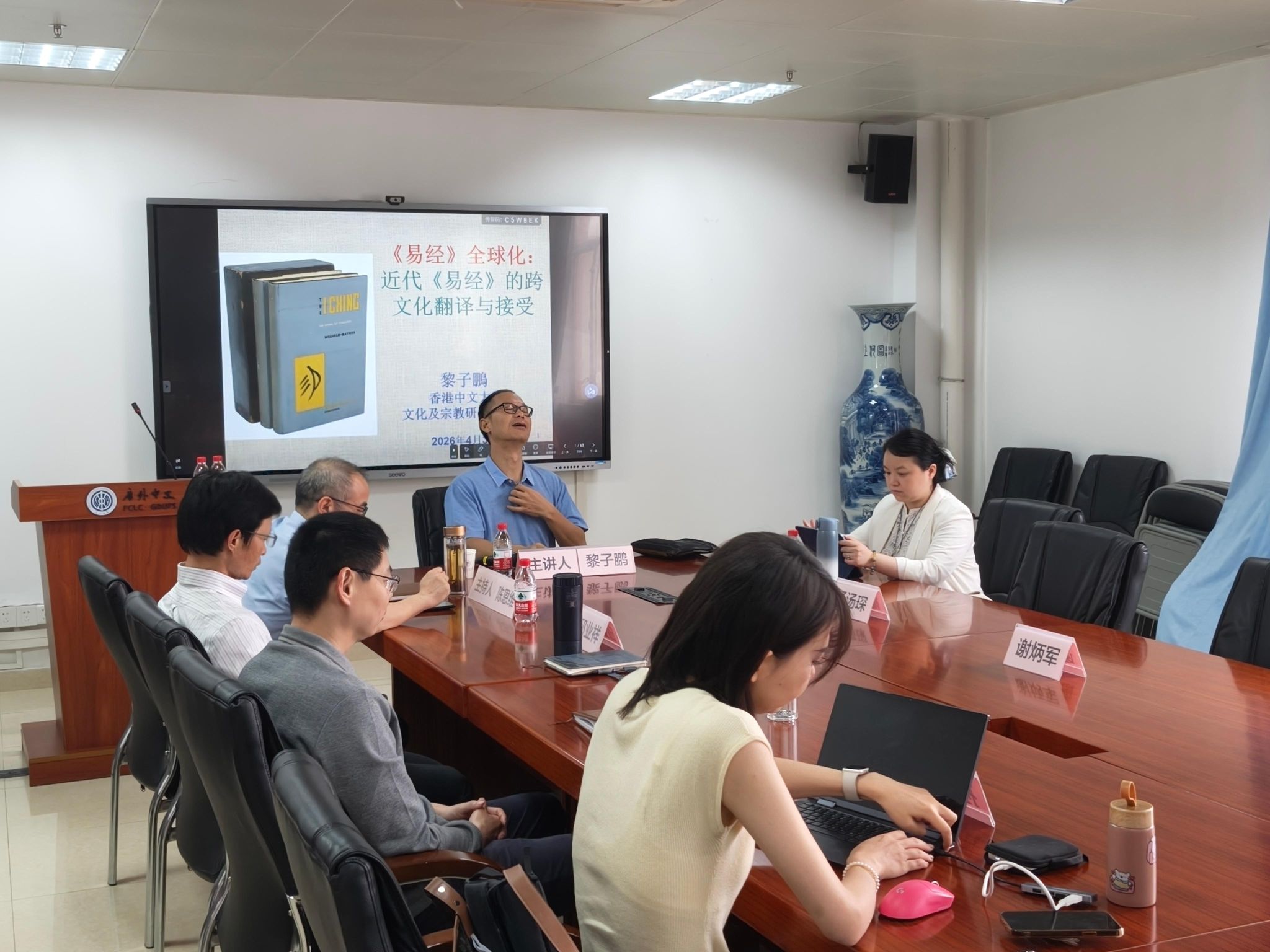 本网讯 2026年4月3日下午14:30,由广东外语外贸大学人力资源部(教师发展中心)主办、广东外语外贸大学中国语言文化学院承办的著名教授论坛第737讲在广外白云山校区第七教学楼407顺利举行。本讲座由香港中文大学文学院黎子鹏教授主讲,广外中文学院陈恩维教授主持,四川大学李以清副研究员、广外中文学院教师邱业祥、左岩、孙鸣晨、谢炳军和李祥等参加与谈,四十余位校内外师生参加讲座。讲座主题为“《易经》全球化:近代《易经》的跨文化翻译与接受”。