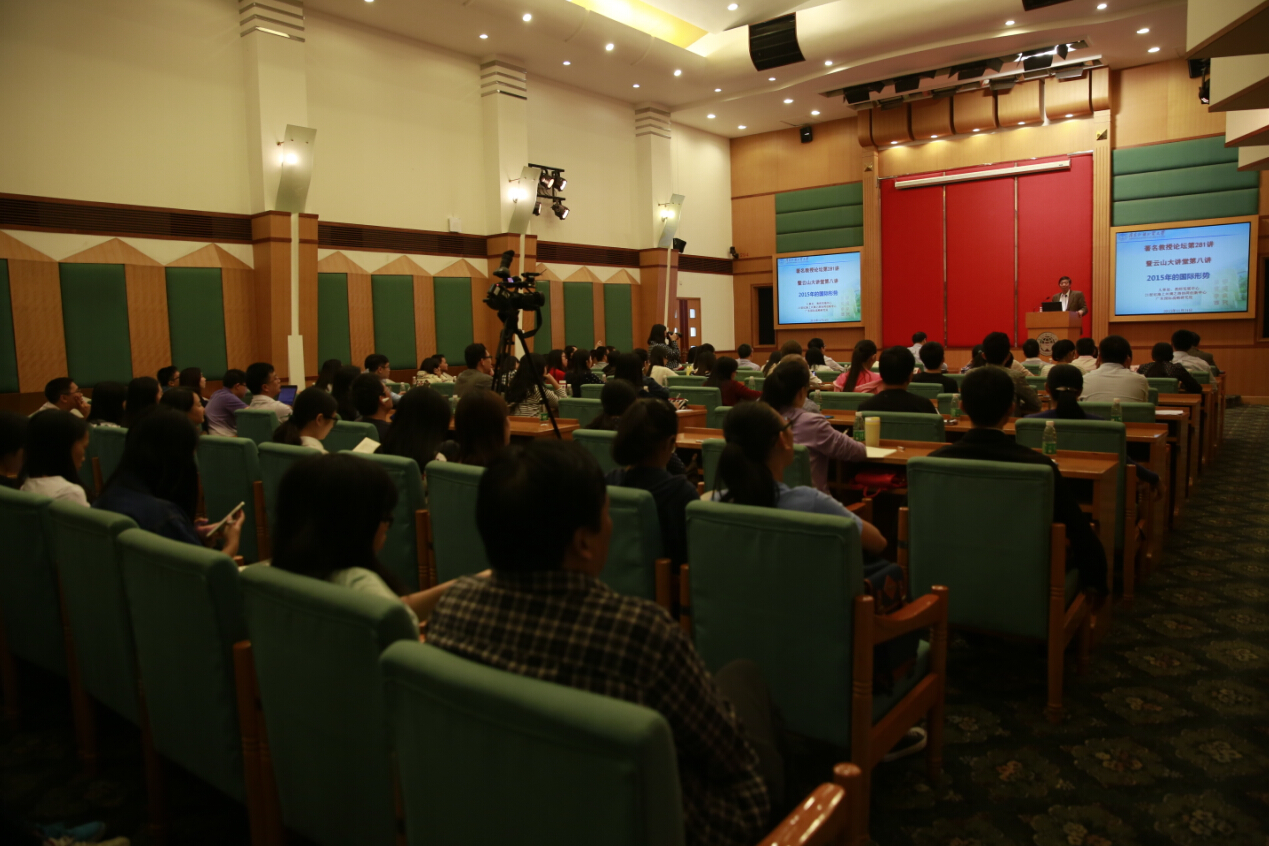 11月24日,著名教授讲坛第281讲暨云山大讲堂第八讲:“2015年的国际形势”在国际会议厅举行。活动由广东外语外贸大学人事处、教师发展中心主办,21世纪海上丝绸之路协同创新中心、广东国际战略研究院承办。中国外交部外交政策咨询委员会委员、原外交学院院长、驻法大使吴建民作客广外,与广外师生分享当前国际形势。