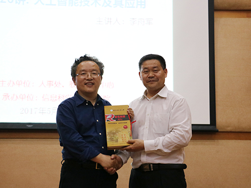 2017年5月5日,著名教授论坛第326讲:人工智能技术及其应用,在图书馆报告厅顺利举行。本次论坛由人事处、教师发展中心主办,信息科学与技术学院(下简称为“信息学院”)承办。论坛邀请到北京航空航天大学博士生导师,信息安全系主任,智能信息处理研究所副所长——李舟军教授,为我校师生进行报告。本次论坛由信息学院蒋盛益院长主持。