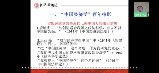 本网讯5月30日下午,主题为“关于中国经济学理论和学科建设的思考”的著名教授论坛第460讲在腾讯会议举行。本次讲座由人事处、教师发展中心主办,经济贸易学院承办。广东外语外贸大学副校长王廷惠教授、经济贸易学院院长张建武院长及200余名师生参与了会议。主讲人是中国人民大学邱海平教授。