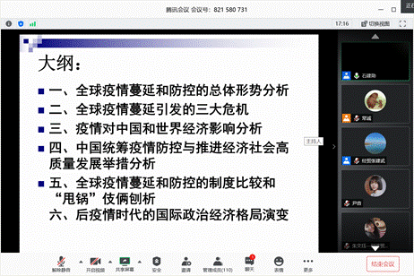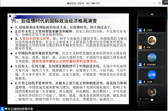 而后,石教授继续分析后疫情时代的国际政治经济格局演变情况,判断出疫情将影响及必然会改变国际政治经济关系,对于百年未有之大变局,中国的外部环境将会更加严峻。但是对于中国,前进步伐将不会在这次危机中受阻,这深奥而不难懂的说法给予参会者思考的方向和空间。