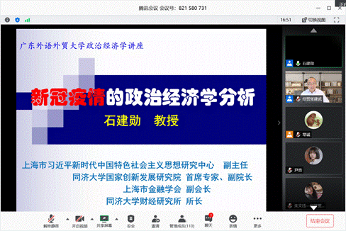 讲座伊始,石建勋教授通过首先以六点大纲提出“新冠疫情”对中国乃至世界,在政治、经济、社会制度、文化等方面的冲击及影响分析。石建勋教授首先对疫情的研判展开,详细阐述人类历史上的重大疫情事件之间的对比,也说明中国在应对危机的优势。从劳动力、劳动资料、劳动对象三方面引出,在全球疫情蔓延中防控、经济活动、政府应对措施的三大危机。石教授以政治经济学的角度,深入浅出谈到疫情对中国及世界经济影响,以外资企业和产业链为例,分析中国统筹疫情防控与推进经济社会高质量发展举措。
