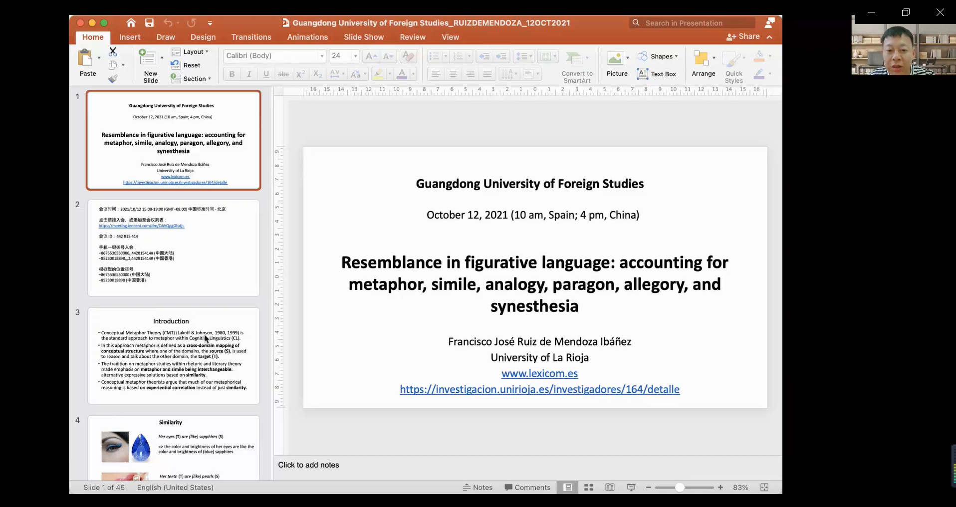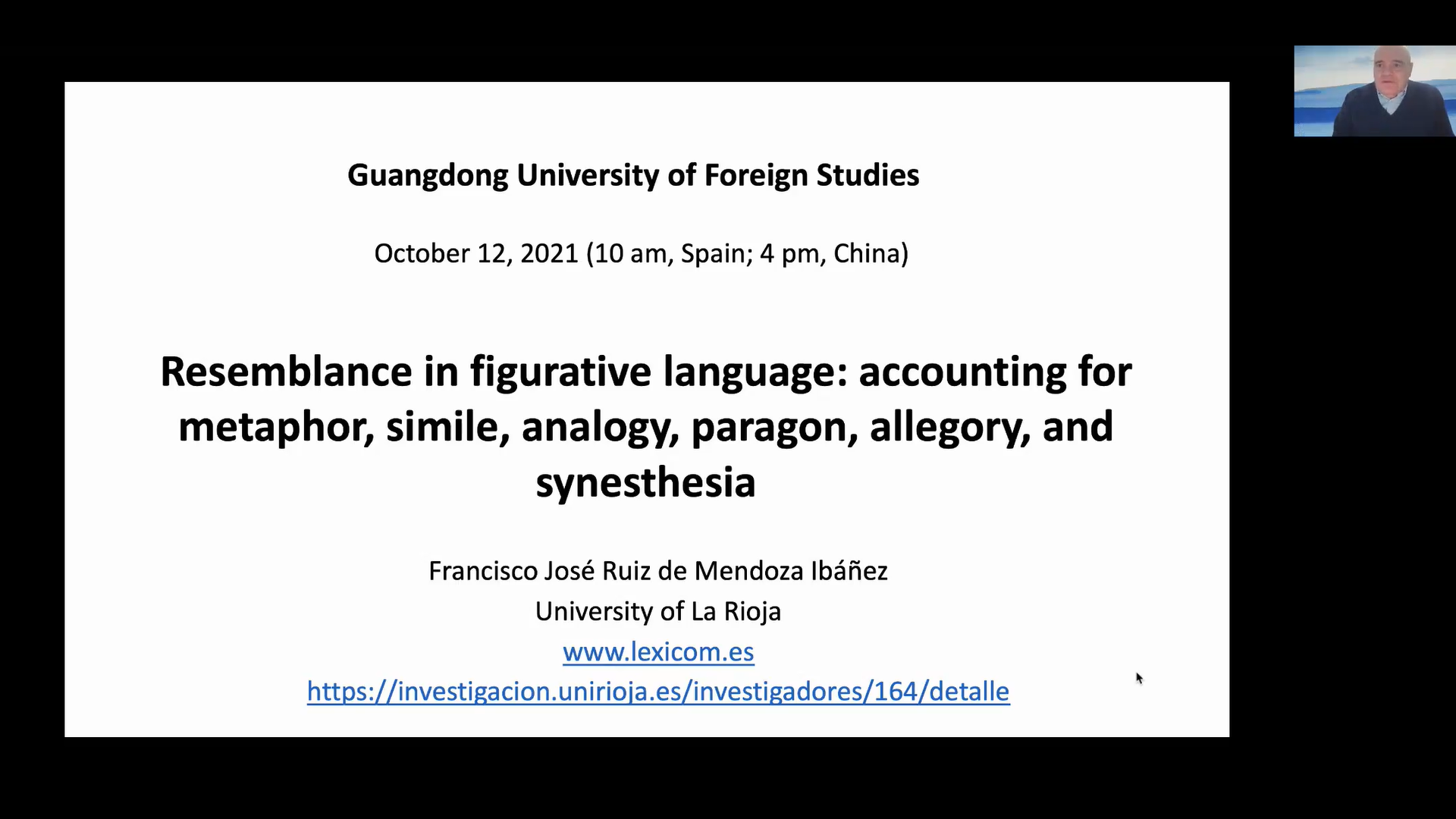 10月12日下午,由人事处、教师发展中心主办,《广东外语外贸大学学报》编辑部承办的学术讲座在腾讯会议线上举行,西班牙拉里奥哈大学人文与教育学院语言学 教授Francisco José Ruiz de Mendoza Ibáñez为我们汇报了题为“Metaphor, Simile, Analogy, Paragon, Allegory, and Synesthesia”的讲座。校内外百余名师生参加了此次讲座。