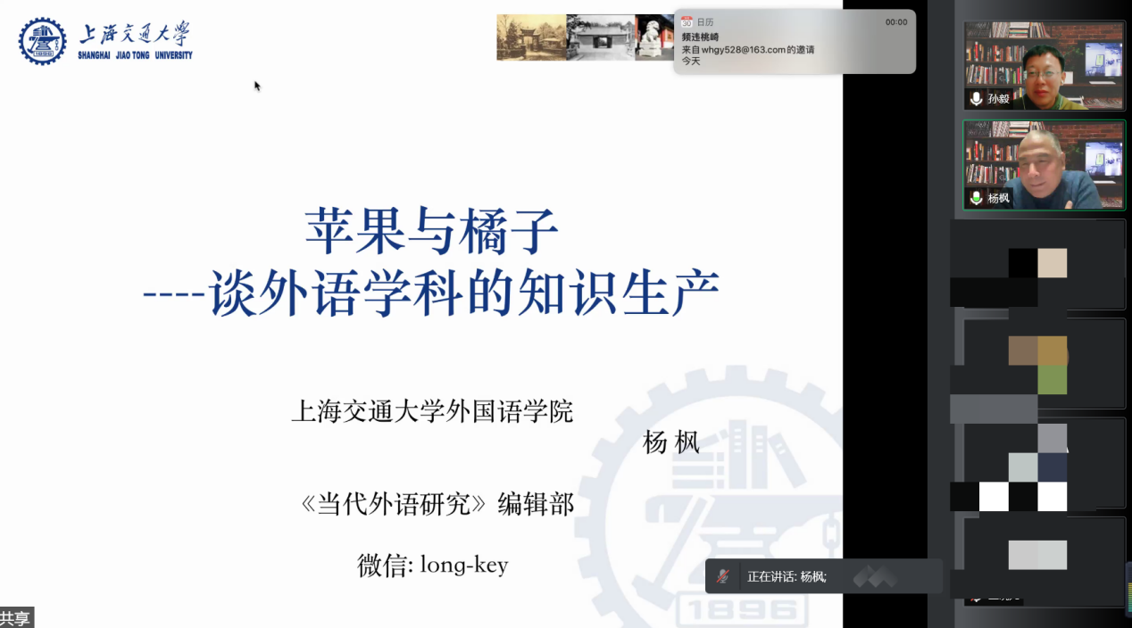 12月30日下午,由人事处、教师发展中心主办、《广东外语外贸大学学报》编辑部承办的著名教授论坛第538讲在腾讯会议线上举行,上海交通大学外国语学院杨枫教授为我们汇报了题为“苹果与橘子——谈外语学科的知识生产”的讲座。校内外百余名师生参加了此次讲座。