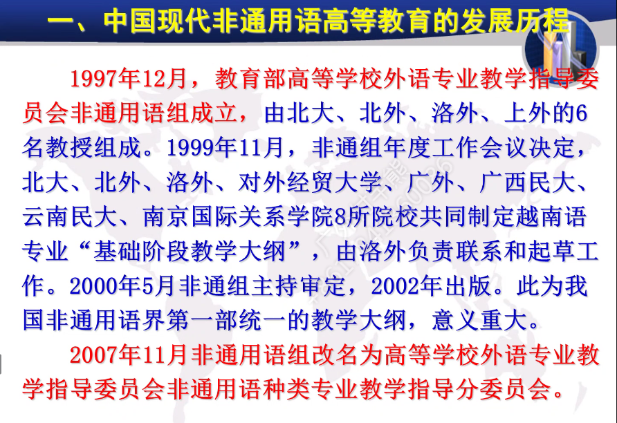 讲座伊始,钟智翔教授仔细梳理了中国现代非通用语高等教育的四个发展阶段:20世纪40-50年代的起始阶段、20世纪50-60年代的初步发展阶段、20世纪70-90年代的停滞与恢复阶段以及21世纪到现今的高速发展阶段,着重讲述了中国现代非通用语高等教育的发展历程。起始阶段,非通用语高等教育于国家生死存亡之际应运而生,为适应时代发展要求,成立之初便以“外语课程+跨学科课程”的复合型人才培养模式,承载着民族和历史的重任,为国家培养先进军事外语人才做出重大贡献;初步发展阶段,外语非通用语种专业建设和人才培养,真正起步于1949年10月1日新中国成立后,随着中国与世界各国相继建交,拉开了新中国派遣留学生的序幕,同时为培养相关语种的首批师资力量奠定基础;停滞与恢复阶段,1966年始的十年浩劫整体上影响了非通用语种人才培养的发展进程,改革开放后,非通用语教育迈入新的发展时期,但由于国内外形势复杂多变,导致非通用语的发展机遇与挑战并存;高速发展阶段,21世纪以来,教育部设立多项扶持计划,助力非通用语发展,截止至2018年,非通用语语种数量已高达96种,教师队伍逐渐壮大,科研成果日益显著,其中非通用语教育基地主要分布于北京外国语大学、洛外、北京大学、上海外国语大学、广东外语外贸大学、广西民族大学等高校。