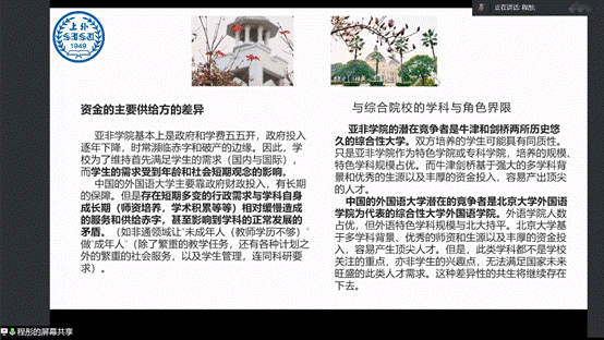教授首先介绍了伦敦大学亚非学院(以下简称“学院”)建立的背景和初始目的,并讲述了其在“二战”后转型的目标和原因。随后,程教授提到了语言教学的“技术型”和“研究型”概念,从“语言教学及其作用”、“语言的重要性”、“当前研究生教育和教师队伍的情况与要求”等方面具体论述了语言人才的培养方法。针对“学院与综合学校的差异”问题,程教授从“方向性”、“资金供给”和“综合学校的学科及其角色局限”三个方面将学院与一般综合性的大学进行了比较。最后,程教授指出,“文化交流受到人工智能冲击”是学院当前所面临的困境,并相应地给出了外国语大学今后的突破方向和破局方法。