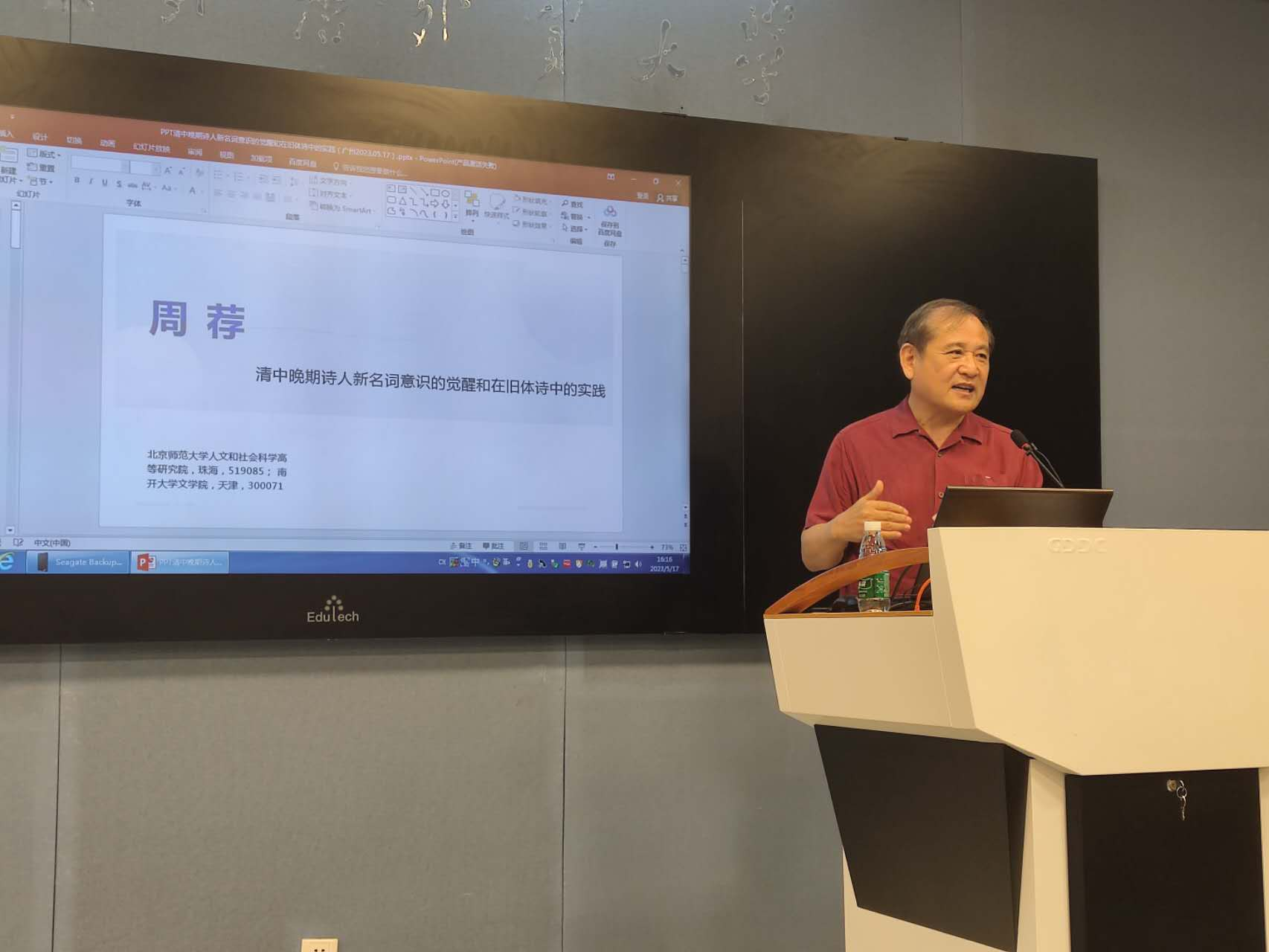 本网讯 2023年5月17日下午,由我校人力资源部(教师发展中心)主办,外国语言学及应用语言学研究中心承办。邀请北京师范大学周荐教授开展了题为“清中晚期诗人新名词意识的觉醒和在旧体诗中的实践”的学术研讨。讲座由章宜华教授主持,中心的多位教师和研究生聆听了本次讲座。