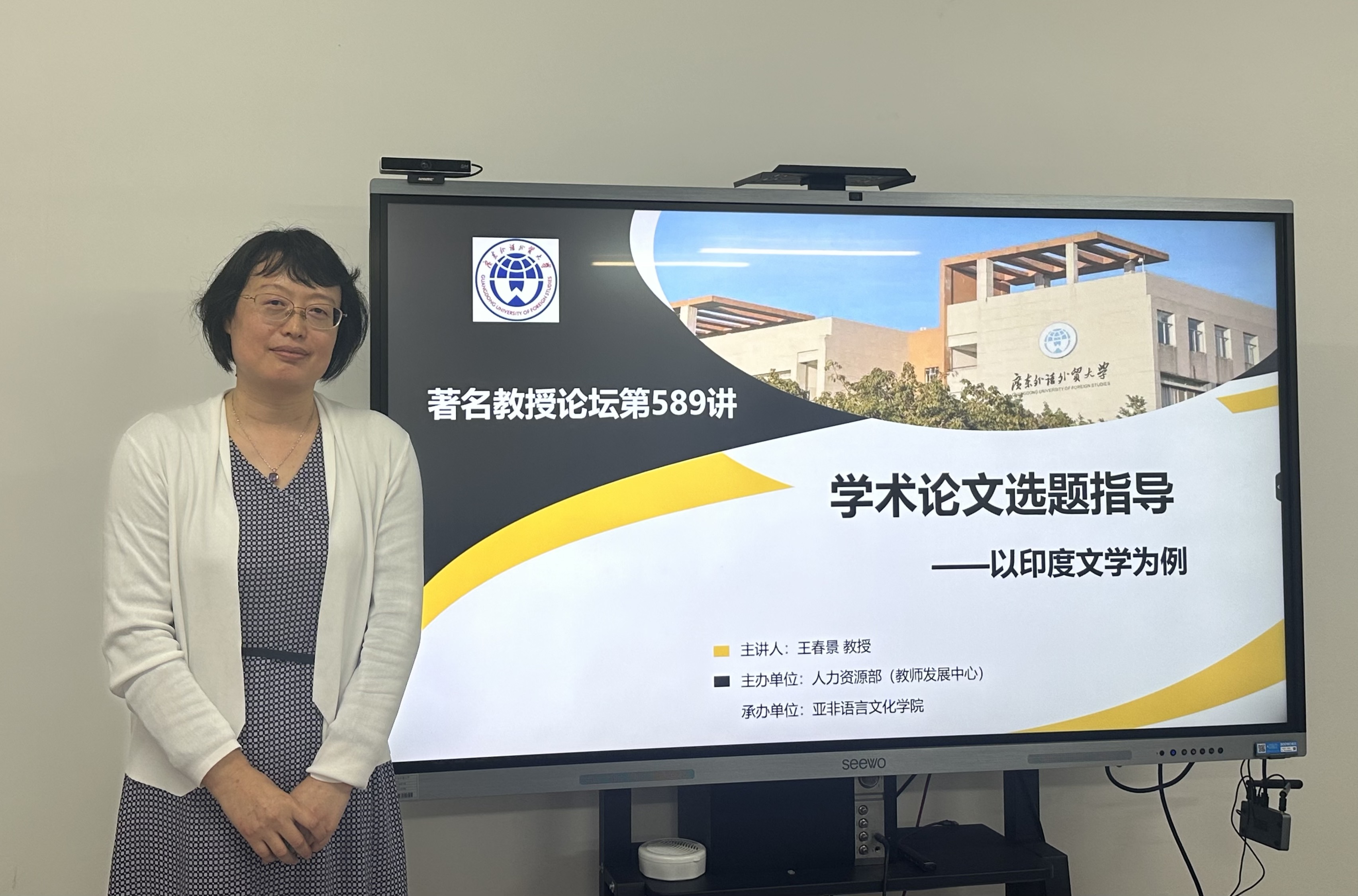 本网讯 2023年5月17日下午,深圳大学人文学院王春景教授做客我校著名教授论坛589讲。本次讲座由广东外语外贸大学人力资源部(教师发展中心)主办,亚非语言文化学院承办,亚非学院院长助理田克萍副教授主持,亚非文学与翻译学研究团队及其他院系的师生聆听了讲座。