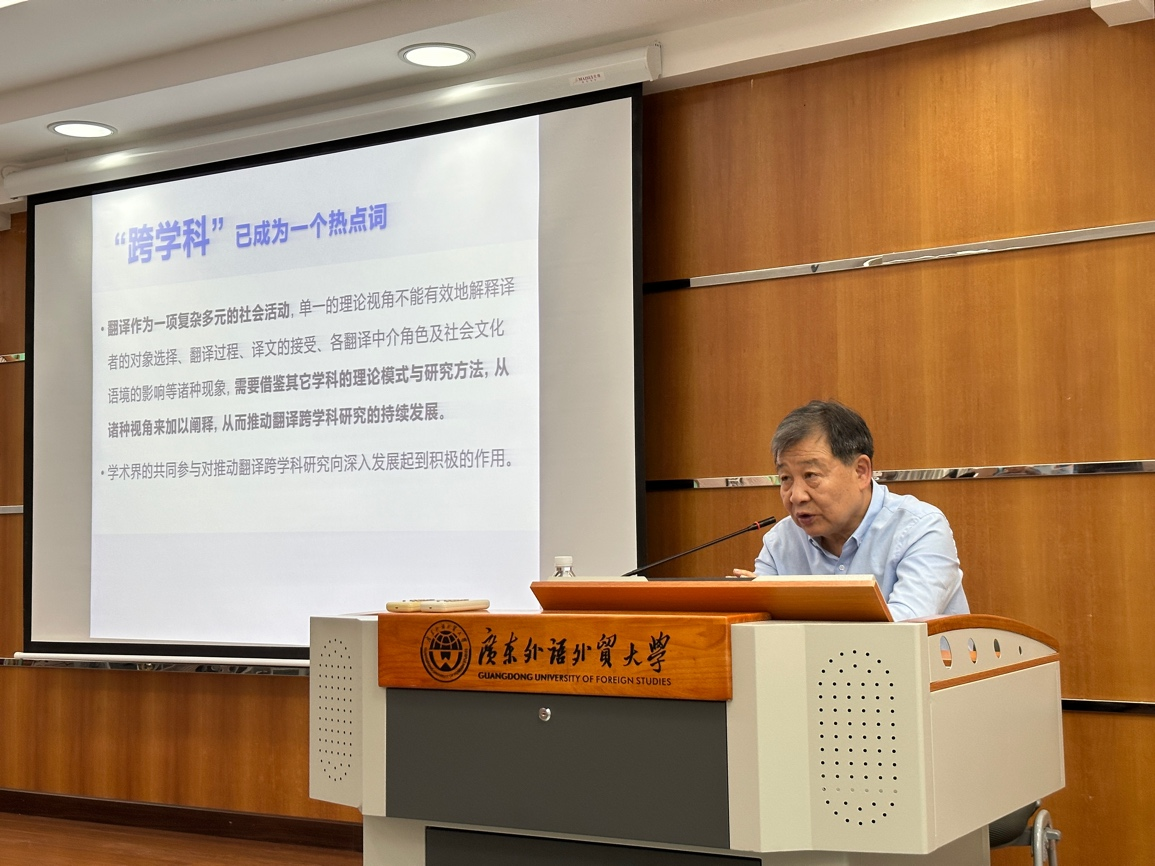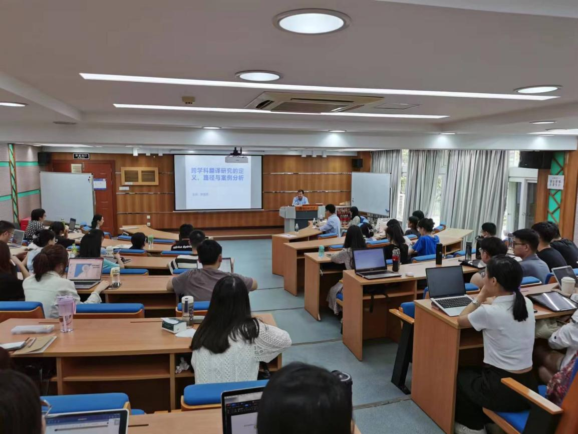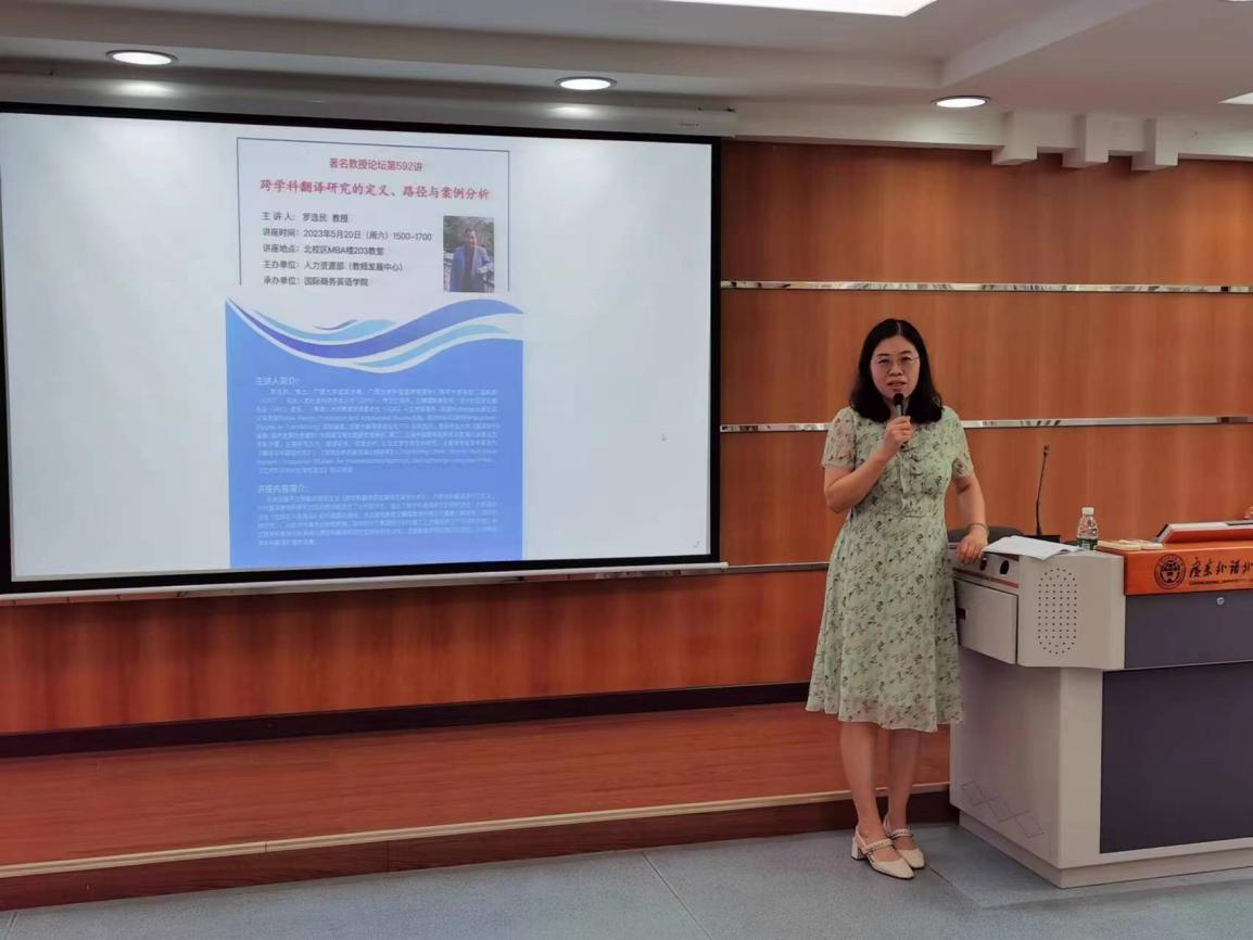 本网讯 2023年5月20日下午15:00,由广东外语外贸大学人力资源部(教师发展中心)主办,广东外语外贸大学国际商务英语学院(以下简称“商英学院”)承办的著名教授论坛第592讲在北校区MBA楼203教室顺利举行。广西大学君武学者、广西大学外国语学院院长罗选民教授,作了题为“跨学科翻译研究的定义、路径与案例分析”的精彩报告。讲座由商英学院副院长刘平教授主持,商英学院院长胡春雨教授、多名青年学者、商英学院及其他学院的研究生线下聆听讲座,会场座无虚席。