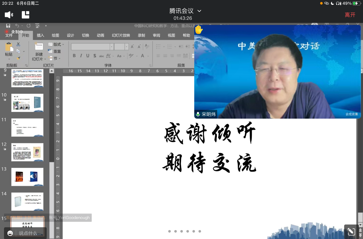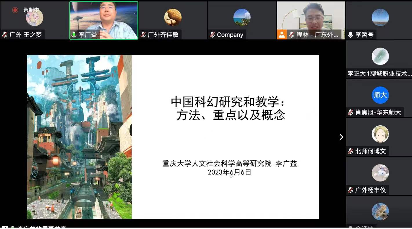 本网讯 2023年6月6日晚,由广东外语外贸大学人力资源部(教师发展中心)主办、广东外语外贸大学外国文学文化研究院人文前沿跨学科研究团队承办的著名教授论坛601讲以线上形式在腾讯会议顺利举行。本讲座由重庆大学中文系李广益教授主讲、广外外国文学文化研究院程林副教授主持,讲座主题为“中国科幻研究和教学:方法、重点以及概念”。