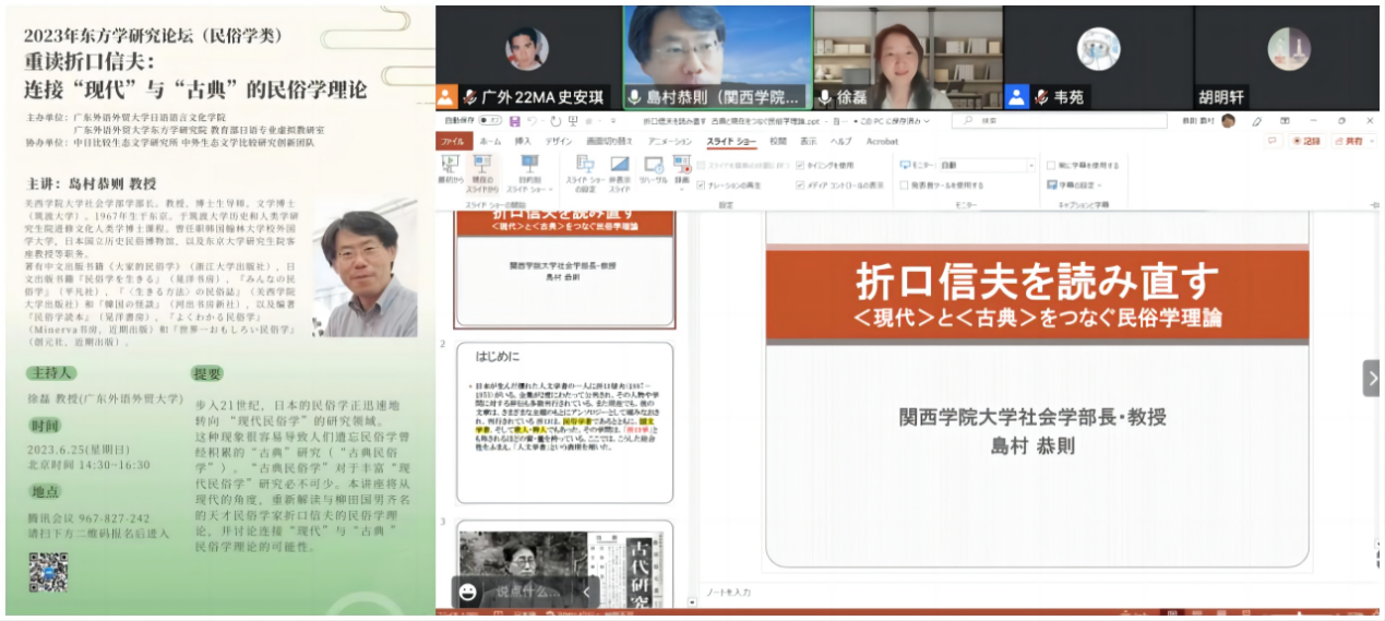 本次讲座题为“重读折口信夫:连接“现代”与“古典”的民俗学理论”,以线上形式圆满举办。讲座由日语学院徐磊教授主持,副院长程亮总结致辞,共吸引来自日本京都大学、关西学院大学、北海道大学、广岛大学、爱知县立大学,广东外语外贸大学、北京大学、中国人民大学、浙江大学、中山大学、山东大学、华东师范大学、上海外国语大学、北京语言大学、东南大学、烟台大学、南京师范大学、浙江师范大学、中国艺术研究院等数十所高校及科研院所、百余名师生参与。