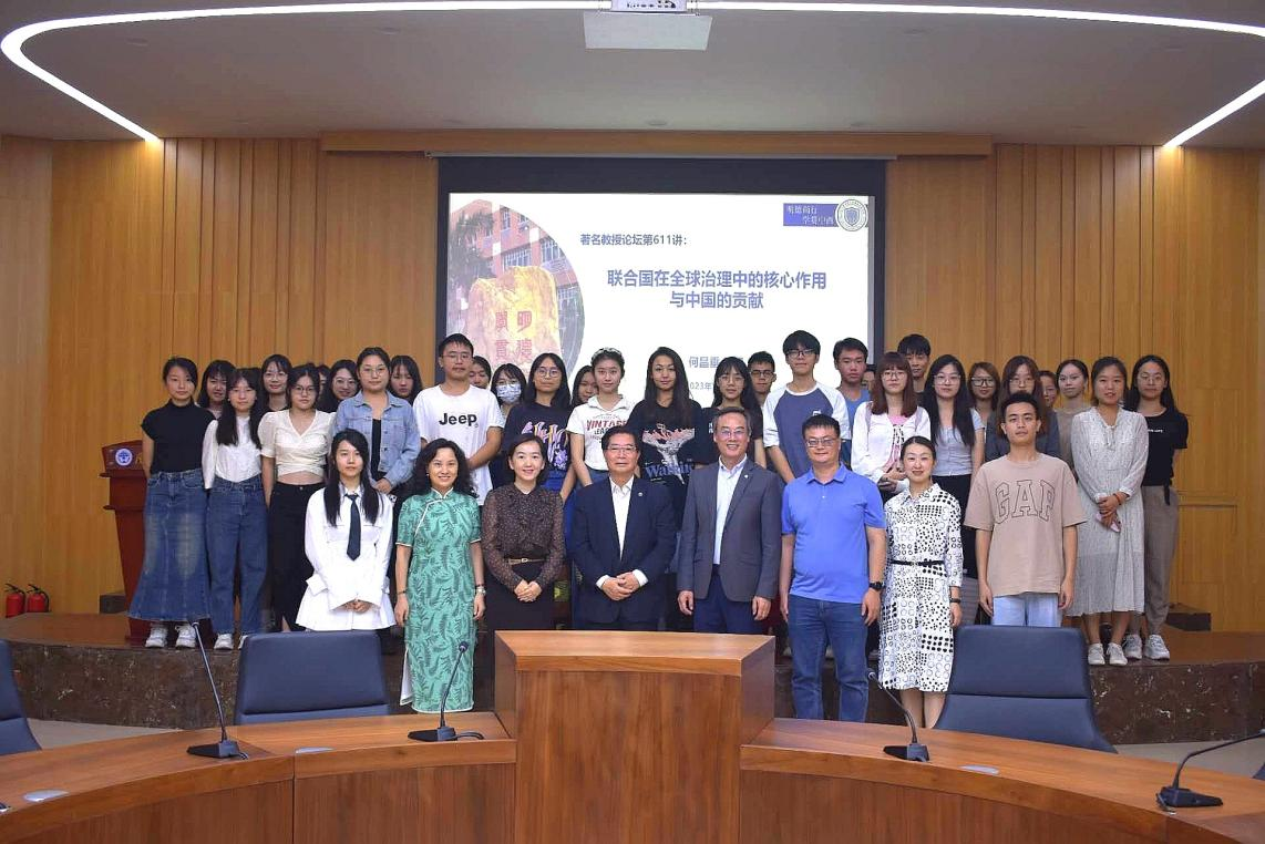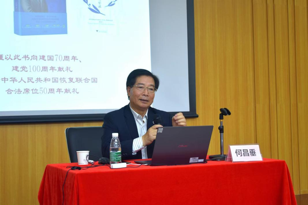 本网讯 10月18日上午10点,由广东外语外贸大学人力资源部(教师发展中心)主办、国际关系学院、区域国别研究院承办的著名教授论坛第611讲在D102国际组织实验室举行。国际欧亚科学院院士、北京大学国关学院特聘教授、联合国粮农组织原副总干事何昌垂教授作题为“联合国在全球治理中的核心作用与中国的贡献”的讲座。复旦大学联合国与国际组织中心主任张贵洪、我院党委副书记陈健、副院长吴艳、副教授孙章季、副教授王璐瑶等参加本次活动。本次讲座由张贵洪教授主持。