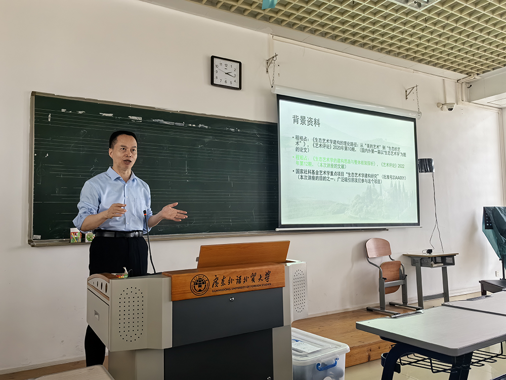本网讯 2024年3月28日下午,中山大学中文系程相占教授应邀来到广东外语外贸大学艺术学院开展了《生态艺术学的建构思路与整体框架》的讲座,本次活动由人力资源部(教师发展中心)主办,艺术学院承办。
