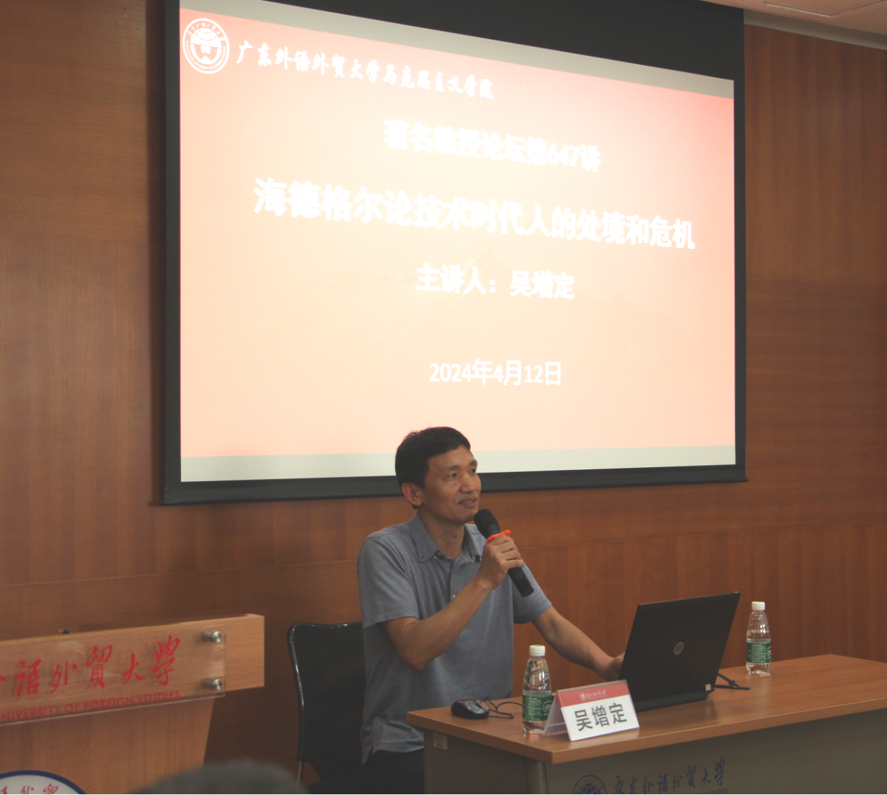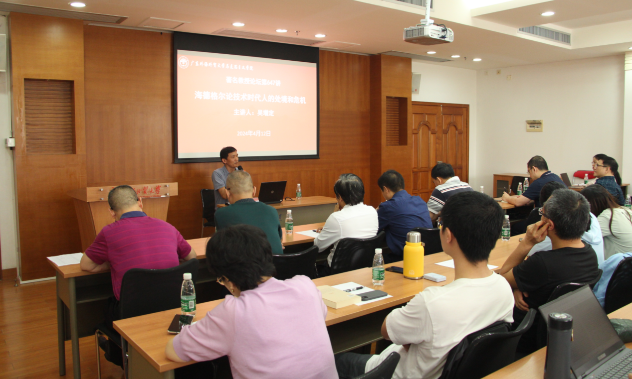 本网讯 2024年4月12日下午,由广东外语外贸大学人力资源部(教师发展中心)主办、广东外语外贸大学马克思主义学院承办的著名教授论坛第647讲《海德格尔论技术时代人的处境和危机》在广外大学城校区第六会议室顺利举办。本讲座由北京大学哲学系教授,博士生导师,中华全国外国哲学史学会常务理事,中国现象学专业委员会委员吴增定教授主讲,广外马克思主义学院毛国民院长主持。