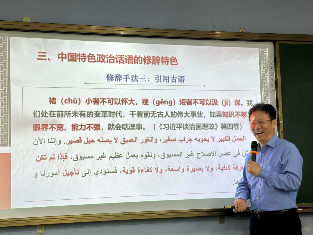随后王教授以《习近平谈治国理政》第三、第四卷为例,从词汇、句式、修辞特色和语篇结构入手,指出了中国政治话语的词汇具有时代性、涵盖性、格式性的特点,需在意译的方法结合中阿文化背景差异进行解释性翻译,注重语法分析。政治话语的句式上大量使用无主句和祈使句并大量使用长句,具有外在联系松散但内在逻辑性强的特点。王教授以建房子为例,生动形象地讲述面对长句翻译时需分清主次成分,再进行内容的完善。在修辞方面,中国政治话语多使用比喻、排比、引用古语等手法。在此情况下,需要将句意灵活转换的同时也要注重语势的表达效果。另外强调翻译时需注意将篇章结构的隐形逻辑关系显性化。
