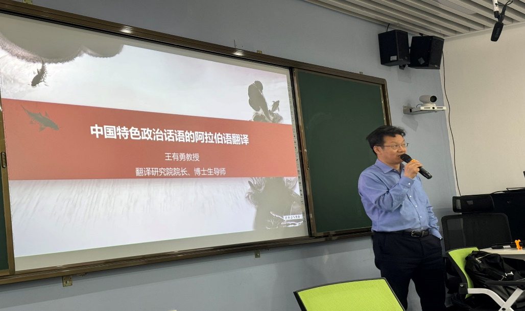 本网讯 2024年5月9日下午14:30,由广东外语外贸大学人力资源部(教师发展中心)主办、广东外语外贸大学亚非语言文化学院承办的著名教授论坛第650讲在广外白云山校区第一教学楼南楼207顺利举行。本讲座由上海外国语大学阿拉伯语系教授、博士生导师王有勇教授主讲,广外亚非语言文化学院牛子牧副院长主持,讲座主题为“中国特色政治话语的阿拉伯语翻译”。