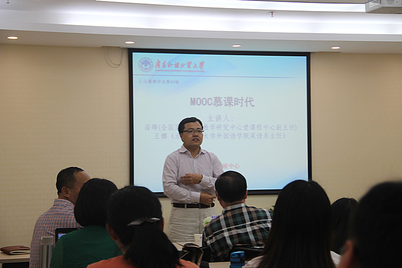 本网讯 10月21日下午,由教师发展中心主办的云山教师沙龙第64场“MOOC慕课时代”在教师发展中心会议室举行,全国高等学校教学研究中心爱课程中心副主任居烽、北京科技大学外国语学院英语系主任王娜分别从不同的角度解剖MOOC,带领本校师生深入了解开放课程。