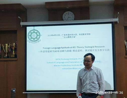 2019年4月22日下午,香港中文大学应用语言学博士、澳门理工学院语言暨翻译高等学校副教授、中国英汉语比较研究会心理语言学专业委员会理事温植胜博士做客广外,以“外语学能研究60年回顾与前瞻:理论建构、测试题开发及教学实践”为题目进行了探讨。此次活动为人事处、教师发展中心主办的“云山教师沙龙”系列活动之一,由英语教育学院承办。