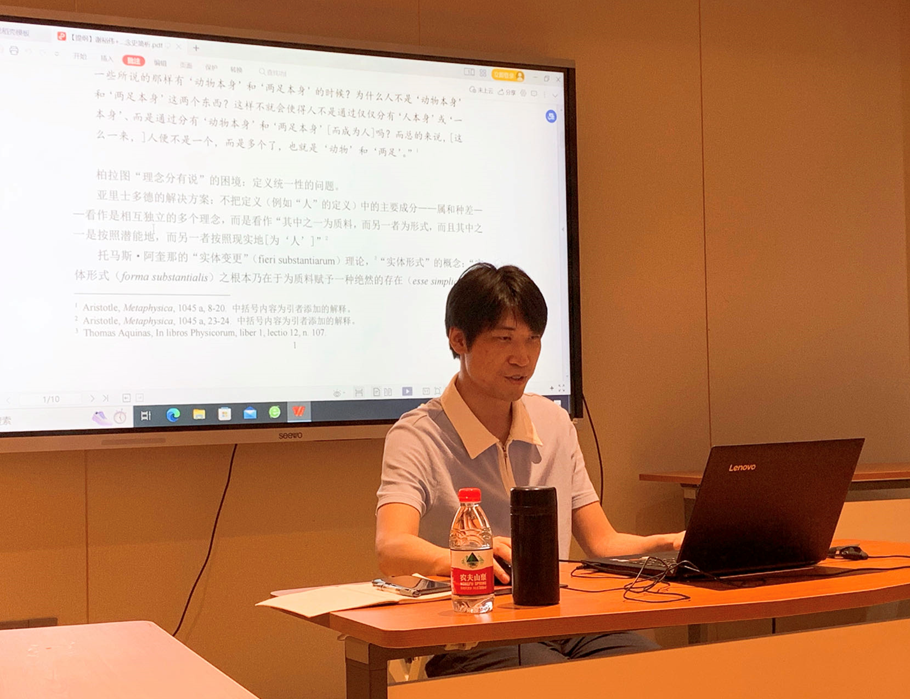 随后,本次讲座的第一位主讲人谢裕伟博士以“物之形而上学观念的近代变迁”为题,对从古希腊、中世纪到近代哲学的物观念的主要演变作了详细的分析与梳理。他指出,古代哲学的物观念(以亚里士多德-阿奎那式的“物”观念为典型)从内在目的论的思维模式出发,将质料与形式看作是物之为物的构成性原则,质料以某种有待实现之形式的潜能的方式存在,并通过形式获得其真正的存在,由此,“物”被理解为“从潜能向现实转变者”。而近代机械式存在论的物观念(以笛卡尔为主要代表)虽然保留了古代质料与形式的物概念框架,但它却不再通过其与潜能-现实的模式的关联而体现出来,毋宁说无论是质料还是形式的内涵都发生了关键性的转变。首先,质料无须依赖于“潜能-现实”框架中的作为有待实现的潜能而存在,而是具有自己独立的本性即“广延”,并且可普遍地被量化规定,质料由此是连续、均质和可分的;其次,形式则被理解为物质之物在量上的某种组织方式。到了莱布尼茨那里,形式与质料的概念既不在“潜能-现实”的变动中成为物之为物的两个相互关联的构成性原则,也不以近代机械论式的物质观被考察,而是分别指向了两种不同的维度:即原初能动力与原初受动力的维度,前者是指某物实现其自身之努力或趋势,后者则是指对这种实现的阻碍。由此而形成了形而上学层面的实体(物)概念[即无广延、非复合的“单子”(monade)],而物质广延物则在次生的力(物理学-力学层面上的力)的基础上进行研究。而后,17-18世纪以沃尔夫、鲍姆嘉登为代表的德国的学院形而上学体系的物观念,则体现了一种对以上物观念的创造性“综合”的特征。一方面,“实体”(substantia)概念不再被突出地强调,取而代之的是更为普泛化的“存在物”(ens)概念,“存在物”作为可以理性地谈论和认识的一切东西,提供了可以在最普遍的意义上谈论物的一种方式,而一门“普遍形而上学”也将以“存在物”为其核心对象。谢裕伟博士最后指出,康德的“客体”概念呈现出对物观念的一种先验哲学式的转折,其区别于莱布尼茨主义存在论的物观念的地方在于:它强调以感觉为实在性的来源,以统觉的原初的综合统一性为客观性根据,以先天的知性原理体系为规定性秩序。