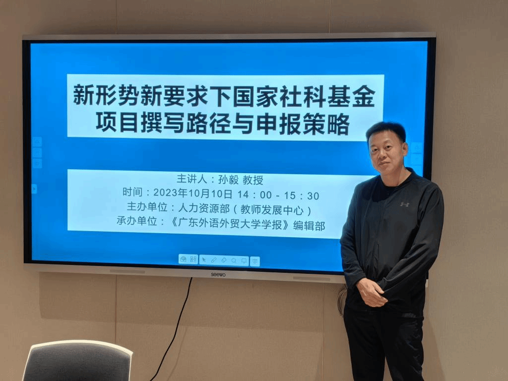 2023年10月10日下午2点,《广东外语外贸大学学报》编辑部承办的“青年教师沙龙第八讲:新形势新要求下国家社科基金项目撰写路径与申报策略“专题讲座于白云山校区科研楼一楼会议室顺利举行。此次讲座由校人力资源部(教师发展中心)主办,《广东外语外贸大学学报》编辑部承办,《广东外语外贸大学学报》主编孙毅教授担任主讲人。