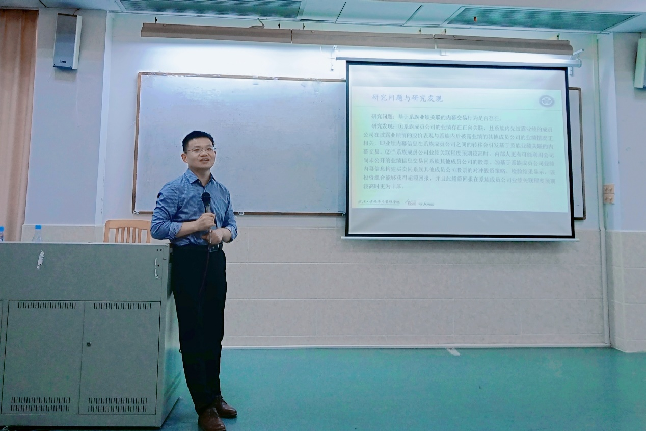 2023年11月23日下午,会计学院于D座312会议室举办了青年教师沙龙第12讲,本次讲座又人力资源部(教师发展中心)主办,会计学院承办。讲座由会计学院龙文滨教授主持,邀请潘红波教授作为主讲嘉宾,带来题为“系族企业内幕交易研究:基于业绩关联的视角”的论文分享。潘红波教授是武汉大学经济与管理学院会计系教授,博士生导师,入选财政部会计领军人才(学术类)、武汉大学“珞珈青年学者”。
