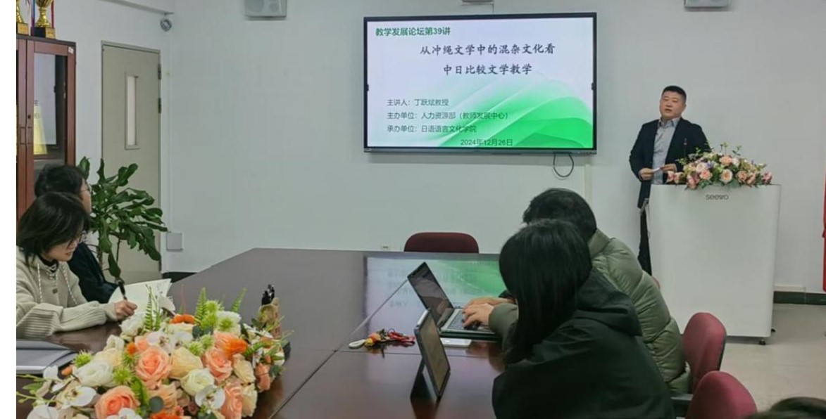 本网讯 2024年12月26日上午,教学发展论坛第39讲在白云山校区第一教学楼北333室精彩开讲。本次讲座由人力资源部(教师发展中心)主办,日语语言文化学院承办,主讲人是日语学院丁跃斌教授,主题为“从冲绳文学中的混杂文化看中日比较文学教学”,讲座由邓宇阳博士主持。