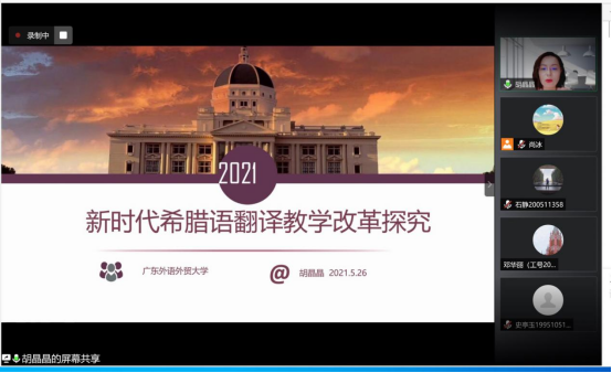 2021年5月26日下午,受广东外语外贸大学人事处·教师发展中心和西方语言文化学院邀请,上海外国语大学希腊语专业胡晶晶副教授作了题为“新时代希腊语翻译教学改革探究”的线上讲座。