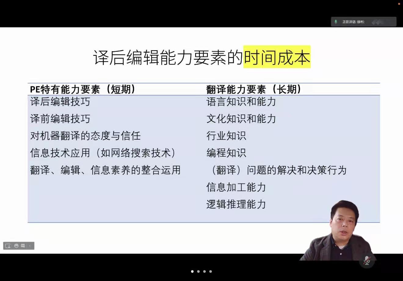 首先,徐教授对译后编辑的概念、缘起、历史以及实践应用的全面开展进行了详细阐述,并提出简略译后编辑和全面译后编辑两种类型和做法。接着,徐教授介绍了译后编辑实践经历的三个阶段。针对一些否定或怀疑机器翻译和译后编辑的观点,徐教授表示,在只重视结果的社会生存活动中,翻译用机器辅助乃至机器翻译辅助,都是天经地义的——只要你能提供合格的产品。由此,徐教授对译后编辑能力进行了梳理,并提出翻译能力模型需要考虑译后编辑能力要素的时间成本。