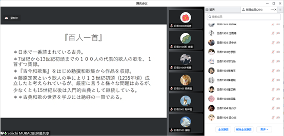 村尾教授先就日本和歌的基本构造和发展历史做了简单介绍。随后选取了吟咏四季和恋爱的和歌作为古典和歌的代表作进行了分析,进而还选取了一些近现代的短歌来讲述和歌有古至今的发展变化及近现代短歌的特征。整场讲座旁征博引,将日本和歌从古代到近现代的特征进行总结归纳,并且相关配图与和歌相得益彰,加深了大家对和歌的理解。