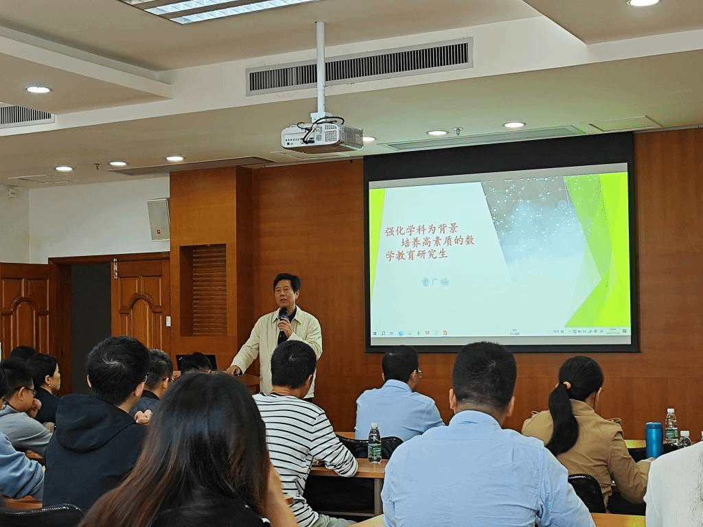 讲座中,曹广福教授从数学教育的本质出发,围绕教育硕士生的基本能力、数学类课程对中小学数学教育的意义等内容,通过若干案例,探讨教育硕士研究生培养过程中应注意的问题,向与会师生介绍如何提升学生的数学素养及数学思维能力。他指出,数学素养的提升是数学教育硕士研究生培养的核心,教育硕士的培养需要更注重学科知识与实际应用的结合,培养学生对知识的深刻理解和创造性思维能力。在这一过程中,问题驱动的教学方法是一种有效的手段,能够培养学生对数学的直觉和思辨能力,使他们更好地应对未来中小学数学教育的挑战。