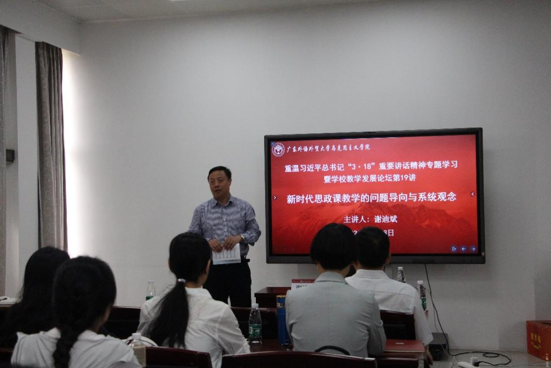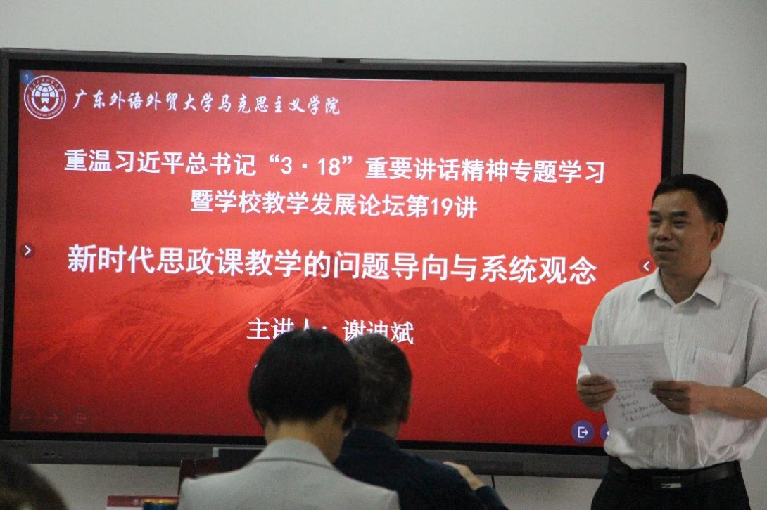 本网讯 2024年3月29日上午,由广东外语外贸大学人力资源部(教师发展中心)主办、广东外语外贸大学马克思主义学院承办的重温习近平总书记“3·18”重要讲话精神专题学习暨学校教学发展论坛第19讲在广外大学城校区A栋教学楼509顺利举行,讲座主题为“新时代思政课教学的问题导向与系统观念”。讲座由广东外语外贸大学马克思主义学院谢迪斌教授主讲,广东外语外贸大学马克思主义学院党委书记麦培年主持。