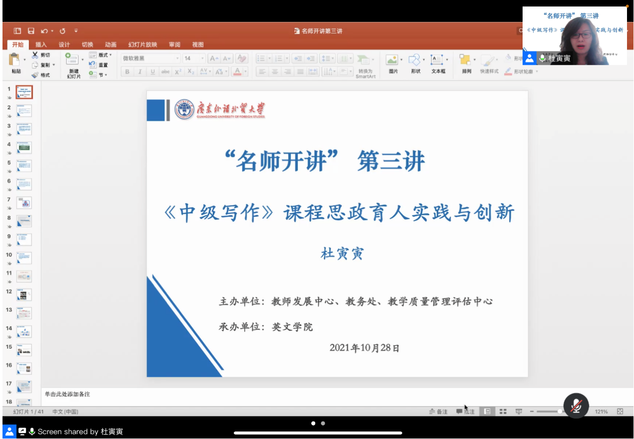 本网讯 2021年10月28日下午,由教师发展中心、教务处、教学质量管理评估中心主办的“名师开讲”项目第三讲于线上顺利开展。讲座由2021年校级教学名师、2020年“惠妍卓越教学奖”获得者、英文学院副教授杜寅寅主讲,与参加讲座的教师分享国家级一流课程和广东省首批课程思政示范课程《中级写作》的课程思政建设经验和心得。